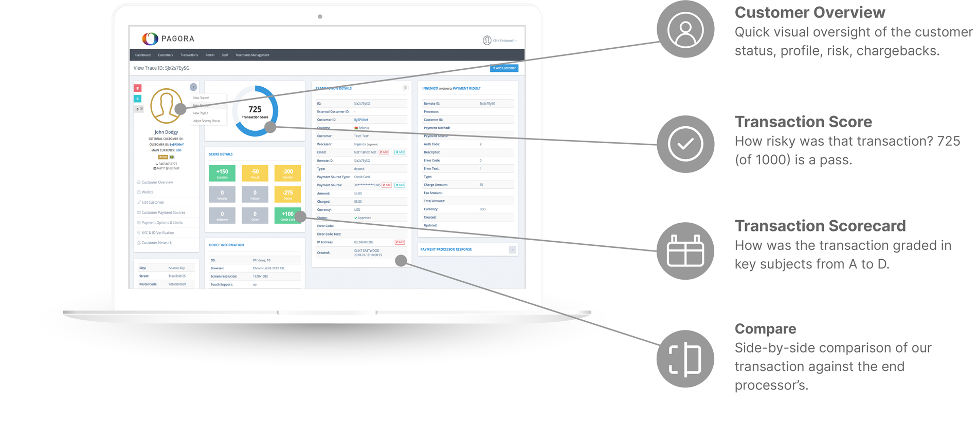 Customer overview, profile, chargebacks, refunds, KYC status, details and quick actions.
